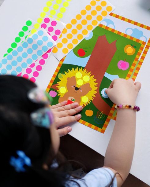 Sebagai contoh produk dot sticker activity. Paket aktivitas menempel stiker ini tampak sederhana, kegiatan menempelkan stiker. Perkembangan utama dalam kegiatan ini adalah melatih motorik halus anak dalam memegang benda kecil. Selain keterampilan motorik halus sebenarnya ada manfaat lain saat bermain dot sticker activity ini: